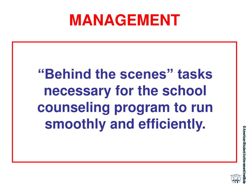 MANAGEMENT “Behind the scenes” tasks necessary for the school counseling program to run smoothly and efficiently.