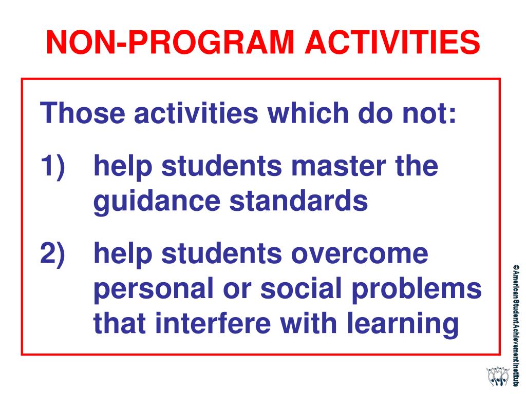 NON-PROGRAM ACTIVITIES • Those activities which do not: • help students master the guidance standards • help students overcome personal or social problems that interfere with learning