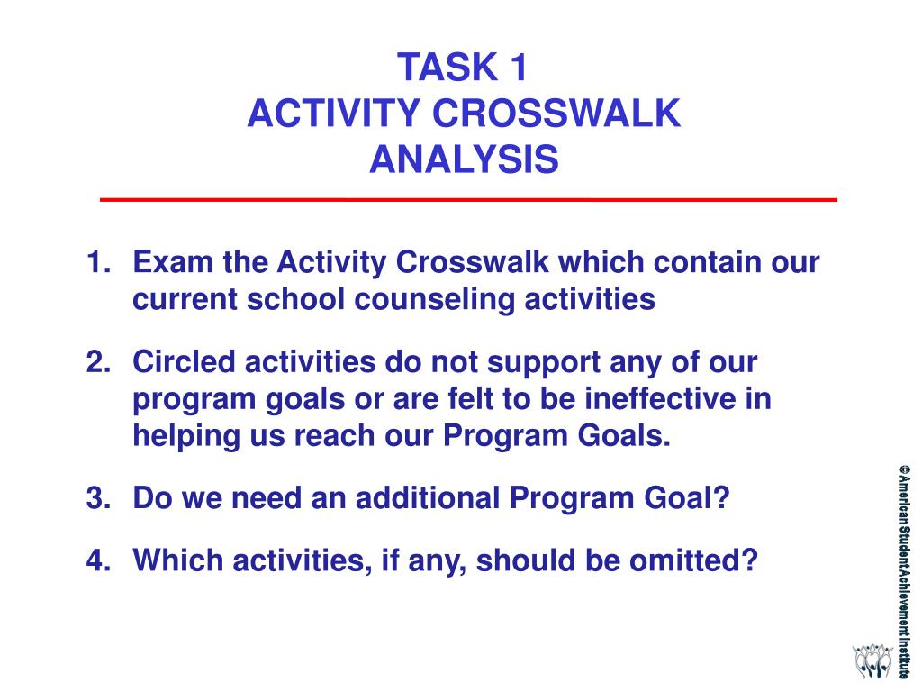 TASK 1 ACTIVITY CROSSWALK ANALYSIS • Exam the Activity Crosswalk which contain our current school counseling activities • Circled activities do not support any of our program goals or are felt to be ineffective in helping us reach our Program Goals. • Do we need an additional Program Goal? • Which activities, if any, should be omitted?