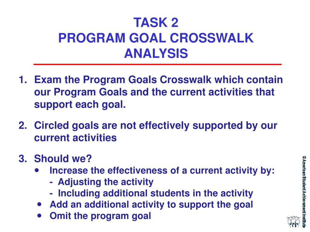 TASK 2 PROGRAM GOAL CROSSWALK ANALYSIS • Exam the Program Goals Crosswalk which contain our Program Goals and the current activities that support each goal. • Circled goals are not effectively supported by our current activities • Should we? • Increase the effectiveness of a current activity by: • - Adjusting the activity • - Including additional students in the activity • Add an additional activity to support the goal • Omit the program goal