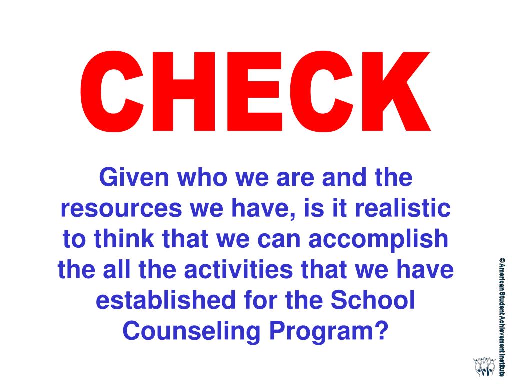 CHECK Given who we are and the resources we have, is it realistic to think that we can accomplish the all the activities that we have established for the School Counseling Program?