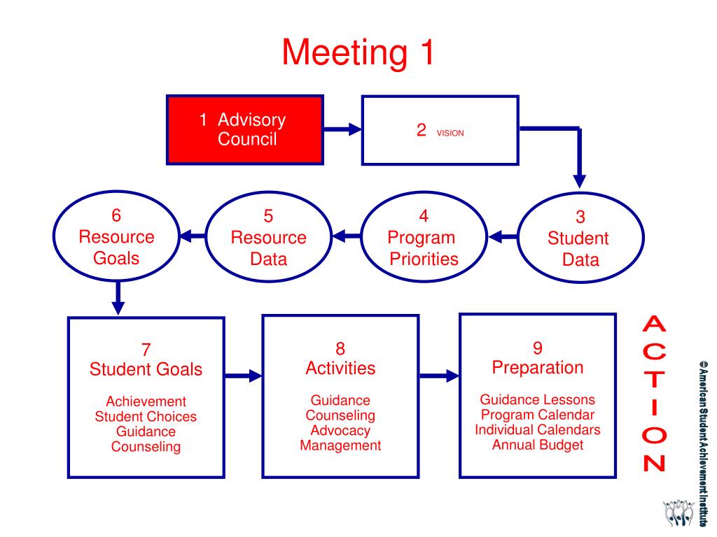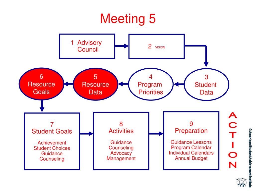 Meeting 5 1 Advisory Council 2 VISION 6 Resource Goals 5 Resource Data 4 Program Priorities 3 Student Data 9 Preparation Guidance Lessons Program Calendar Individual Calendars Annual Budget 8 Activities Guidance Counseling Advocacy Management 7 Student Goals Achievement Student Choices Guidance Counseling ACTION