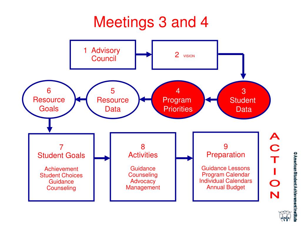 Meetings 3 and 4 1 Advisory Council 2 VISION 6 Resource Goals 5 Resource Data 4 Program Priorities 3 Student Data 9 Preparation Guidance Lessons Program Calendar Individual Calendars Annual Budget 8 Activities Guidance Counseling Advocacy Management 7 Student Goals Achievement Student Choices Guidance Counseling ACTION