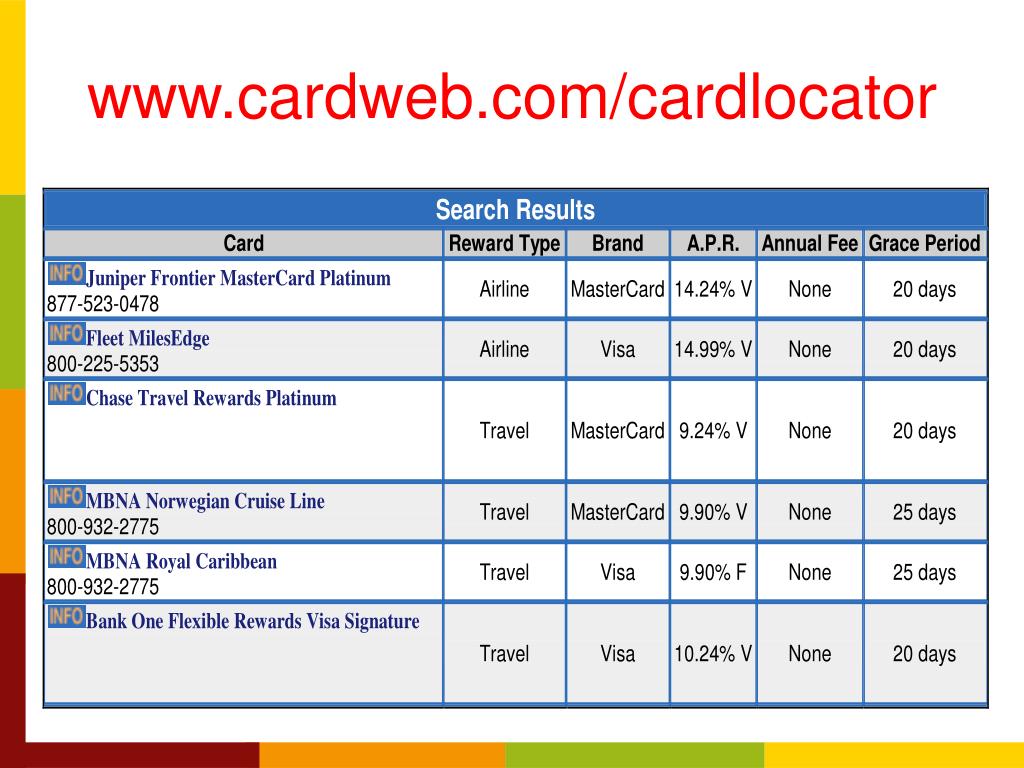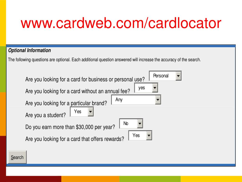 Find a Consumer-Friendly Card • Consumer Reports Top 10 cards have • No universal default • No two-cycle billing • No balance transfer fees • Grace period of at least 25 days • No annual Fees • Based on Cardweb’s analysis of 10,200 card offers in August, 2005.