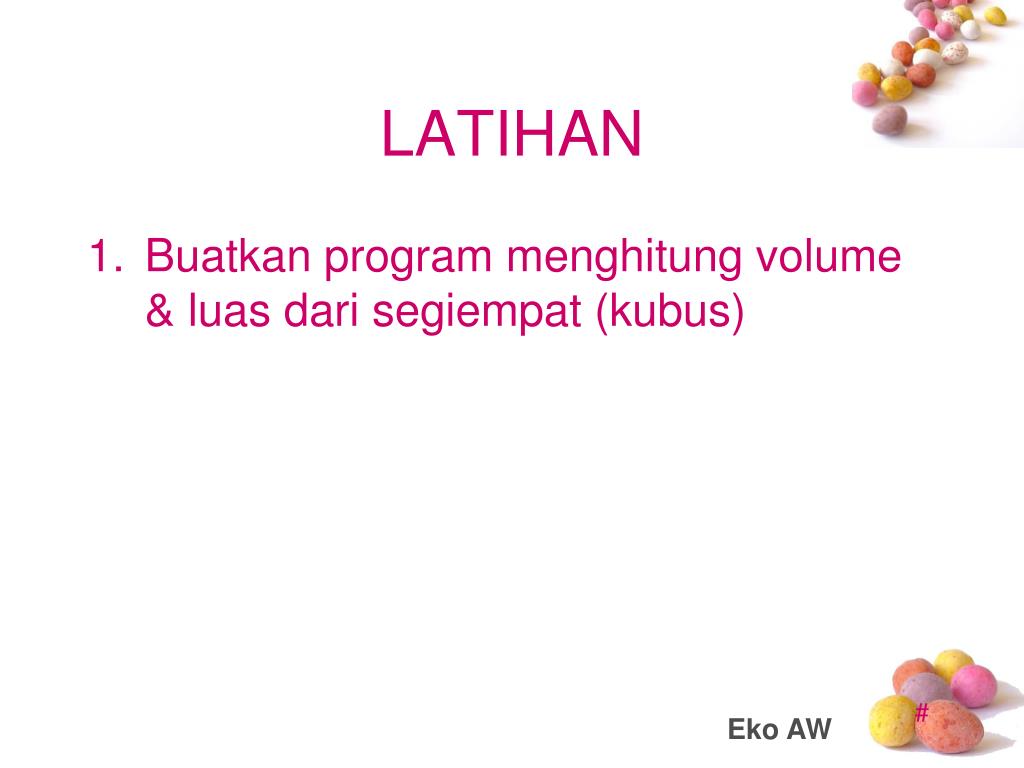 LATIHAN • Buatkan program menghitung volume & luas dari segiempat (kubus) Eko AW