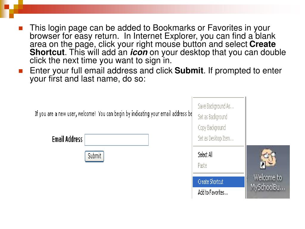 This login page can be added to Bookmarks or Favorites in your browser for easy return. In Internet Explorer, you can find a blank area on the page, click your right mouse button and select Create Shortcut. This will add an icon on your desktop that you can double click the next time you want to sign in. • Enter your full email address and click Submit. If prompted to enter your first and last name, do so: