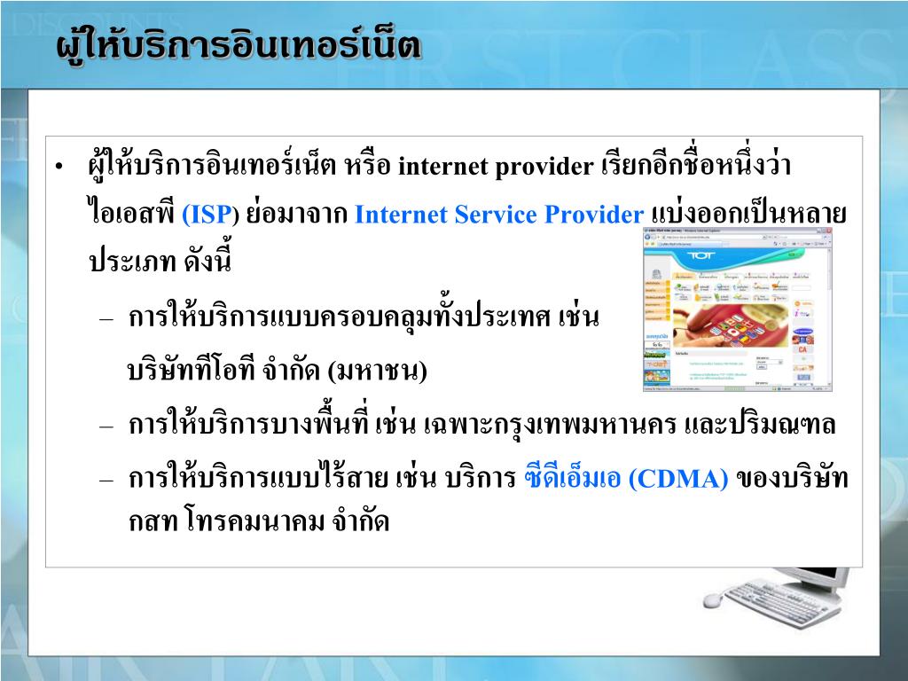 ผู้ให้บริการอินเทอร์เน็ตผู้ให้บริการอินเทอร์เน็ต • ผู้ให้บริการอินเทอร์เน็ต หรือ internetprovider เรียกอีกชื่อหนึ่งว่าไอเอสพี (ISP)ย่อมาจาก Internet Service Provider แบ่งออกเป็นหลายประเภท ดังนี้ • การให้บริการแบบครอบคลุมทั้งประเทศ เช่น บริษัททีโอที จำกัด (มหาชน) • การให้บริการบางพื้นที่ เช่น เฉพาะกรุงเทพมหานคร และปริมณฑล • การให้บริการแบบไร้สาย เช่น บริการ ซีดีเอ็มเอ (CDMA)ของบริษัท กสท โทรคมนาคม จำกัด