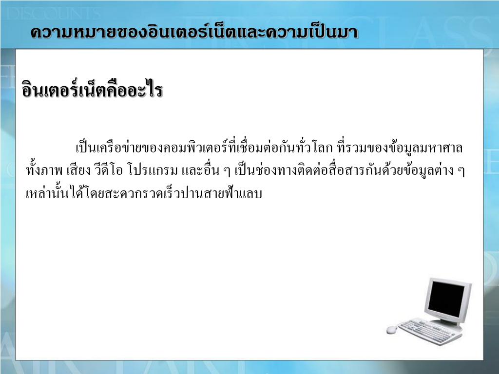 ความหมายของอินเตอร์เน็ตและความเป็นมาความหมายของอินเตอร์เน็ตและความเป็นมา อินเตอร์เน็ตคืออะไร เป็นเครือข่ายของคอมพิวเตอร์ที่เชื่อมต่อกันทั่วโลก ที่รวมของข้อมูลมหาศาล ทั้งภาพ เสียง วีดีโอ โปรแกรม และอื่น ๆ เป็นช่องทางติดต่อสื่อสารกันด้วยข้อมูลต่าง ๆ เหล่านั้นได้โดยสะดวกรวดเร็วปานสายฟ้าแลบ