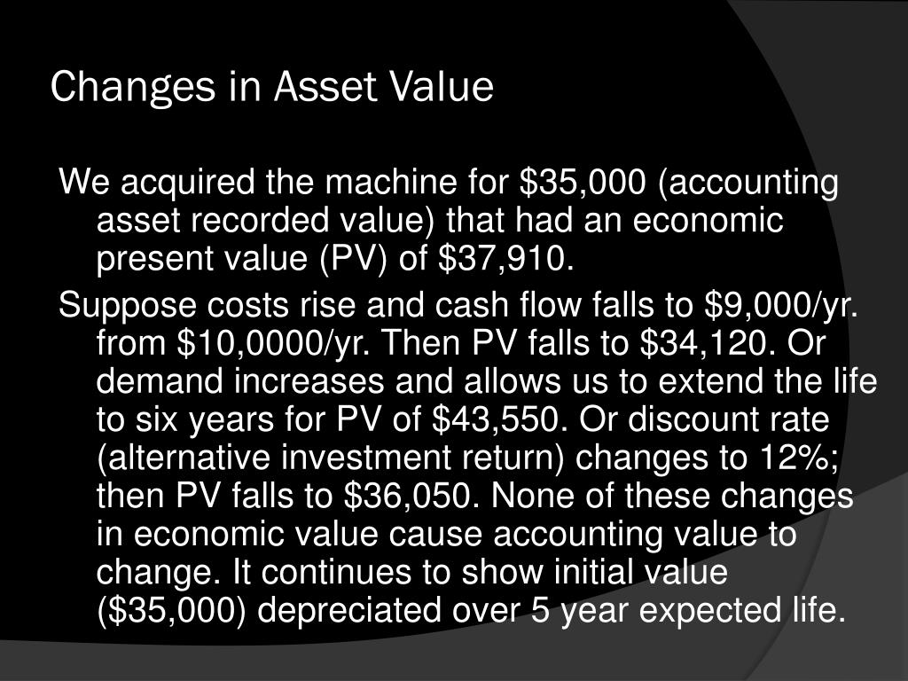 Changes in Asset Value We acquired the machine for $35,000 (accounting asset recorded value) that had an economic present value (PV) of $37,910. Suppose costs rise and cash flow falls to $9,000/yr. from $10,0000/yr. Then PV falls to $34,120. Or demand increases and allows us to extend the life to six years for PV of $43,550. Or discount rate (alternative investment return) changes to 12%; then PV falls to $36,050. None of these changes in economic value cause accounting value to change. It continues to show initial value ($35,000) depreciated over 5 year expected life.