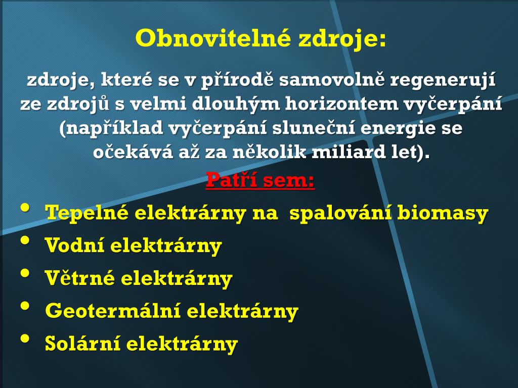 Obnovitelné zdroje: Patří sem: Tepelné elektrárny na spalování biomasy Vodní elektrárny Větrné elektrárny Geotermální elektrárny Solární elektrárny zdroje, které se v přírodě samovolně regenerují ze zdrojů s velmi dlouhým horizontem vyčerpání (například vyčerpání sluneční energie se očekává až za několik miliard let).