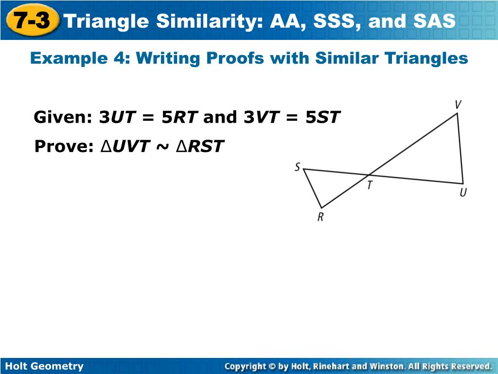 Example 4: Writing Proofs with Similar Triangles Given: 3UT = 5RT and 3VT = 5ST Prove: ∆UVT ~ ∆RST