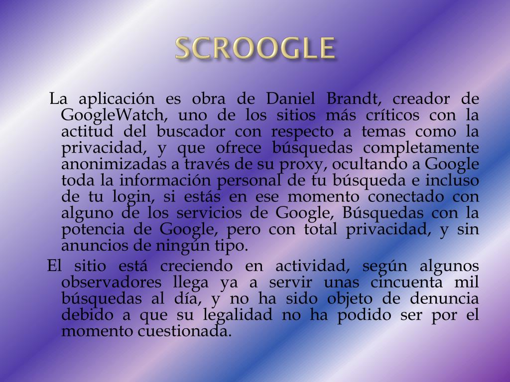 SCROOGLE La aplicación es obra de Daniel Brandt, creador de GoogleWatch, uno de los sitios más críticos con la actitud del buscador con respecto a temas como la privacidad, y que ofrece búsquedas completamente anonimizadas a través de su proxy, ocultando a Google toda la información personal de tu búsqueda e incluso de tu login, si estás en ese momento conectado con alguno de los servicios de Google, Búsquedas con la potencia de Google, pero con total privacidad, y sin anuncios de ningún tipo. El sitio está creciendo en actividad, según algunos observadores llega ya a servir unas cincuenta mil búsquedas al día, y no ha sido objeto de denuncia debido a que su legalidad no ha podido ser por el momento cuestionada.