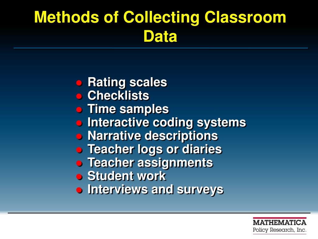 Methods of Collecting Classroom Data • Rating scales • Checklists • Time samples • Interactive coding systems • Narrative descriptions • Teacher logs or diaries • Teacher assignments • Student work • Interviews and surveys