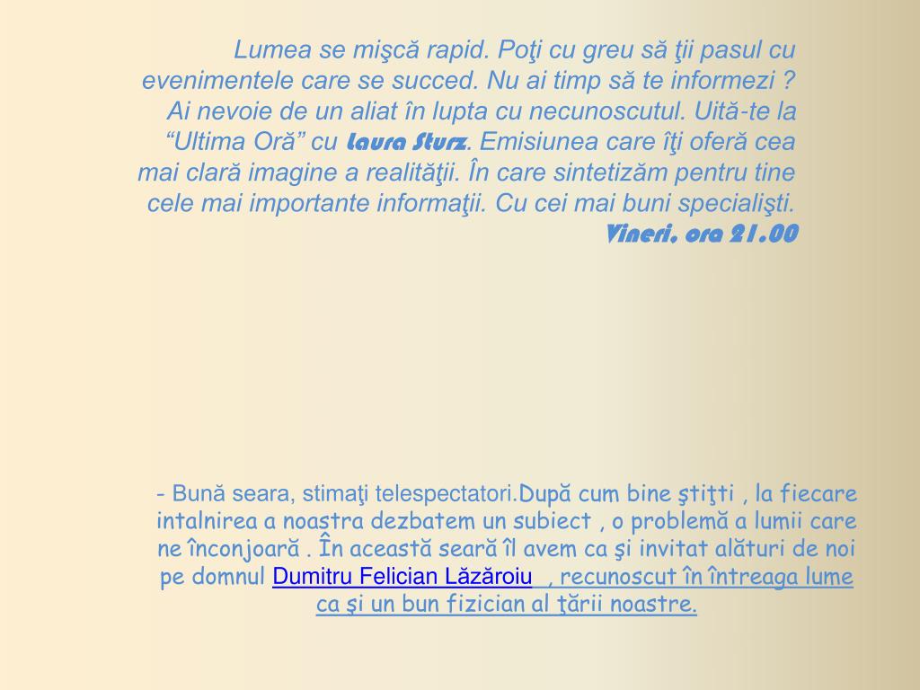 Lumea se mişcă rapid. Poţi cu greu să ţii pasul cu evenimentele care se succed. Nu ai timp să te informezi ? Ai nevoie de un aliat în lupta cu necunoscutul. Uită-te la “Ultima Oră” cu Laura Sturz. Emisiunea care îţi oferă cea mai clară imagine a realităţii. În care sintetizăm pentru tine cele mai importante informaţii. Cu cei mai buni specialişti. Vineri, ora 21.00 - Bună seara, stimaţi telespectatori.După cum bine ştiţti , la fiecare intalnirea a noastra dezbatem un subiect , o problemă a lumii care ne înconjoară . În această seară îl avem ca şi invitat alături de noi pe domnul Dumitru Felician Lăzăroiu , recunoscut în întreaga lume ca şi un bun fizician al ţării noastre.