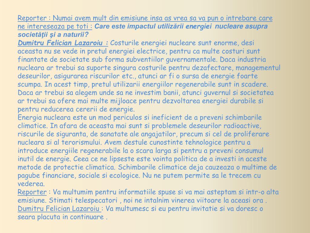 Reporter : Numai avem mult din emisiune insa as vrea sa va pun o intrebare care ne intereseaza pe toti : Care este impactul utilizării energiei nucleare asupra societăţii şi a naturii? Dumitru Felician Lazaroiu : Costurile energiei nucleare sunt enorme, desi aceasta nu se vede in pretul energiei electrice, pentru ca multe costuri sunt finantate de societate sub forma subventiilor guvernamentale. Daca industria nucleara ar trebui sa suporte singura costurile pentru dezafectare, managementul deseurilor, asigurarea riscurilor etc., atunci ar fi o sursa de energie foarte scumpa. In acest timp, pretul utilizarii energiilor regenerabile sunt in scadere. Daca ar trebui sa alegem unde sa ne investim banii, atunci guvernul si societatea ar trebui sa ofere mai multe mijloace pentru dezvoltarea energiei durabile si pentru reducerea cererii de energie. Energia nucleara este un mod periculos si ineficient de a preveni schimbarile climatice. In afara de aceasta mai sunt si problemele deseurilor radioactive, riscurile de siguranta, de sanatate ale angajatilor, precum si cel de proliferare nucleara si al terorismului. Avem destule cunostinte tehnologice pentru a introduce energiile regenerabile la o scara larga si pentru a preveni consumul inutil de energie. Ceea ce ne lipseste este vointa politica de a investi in aceste metode de protectie climatica. Schimbarile climatice deja cauzeaza o multime de pagube financiare, sociale si ecologice. Nu ne putem permite sa le trecem cu vederea. Reporter : Va multumim pentru informatiile spuse si va mai asteptam si intr-o alta emisiune. Stimati telespecatori , noi ne intalnim vinerea viitoare la aceasi ora . Dumitru Felician Lazaroiu : Va multumesc si eu pentru invitatie si va doresc o seara placuta in continuare .