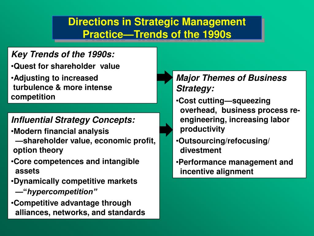 Directions in Strategic Management Practice—Trends of the 1990s • Key Trends of the 1990s: • Quest for shareholder value • Adjusting to increased • turbulence & more intense competition • Major Themes of Business Strategy: • Cost cutting—squeezing • overhead,business process re- • engineering, increasing labor • productivity • Outsourcing/refocusing/ • divestment • Performance management and • incentive alignment • Influential Strategy Concepts: • Modern financial analysis • —shareholder value, economic profit, • option theory • Core competences and intangible • assets • Dynamically competitive markets • —“hypercompetition” • Competitive advantage through • alliances, networks, and standards