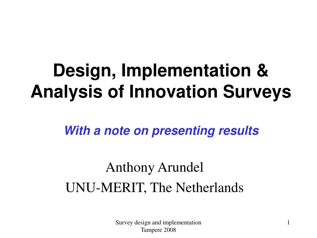 Design, Implementation & Analysis of Innovation SurveysWith a note on presenting results Anthony Arundel UNU-MERIT, The Netherlands Survey design and implementation Tampere 2008
