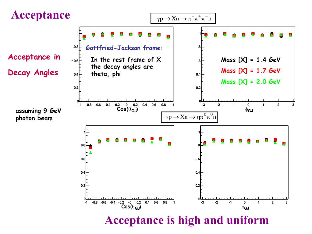 Acceptance Gottfried-Jackson frame: Acceptance in In the rest frame of X Mass [X] = 1.4 GeV the decay angles are Mass [X] = 1.7 GeV Decay Angles theta, phi Mass [X] = 2.0 GeV assuming 9 GeV photon beam Acceptance is high and uniform