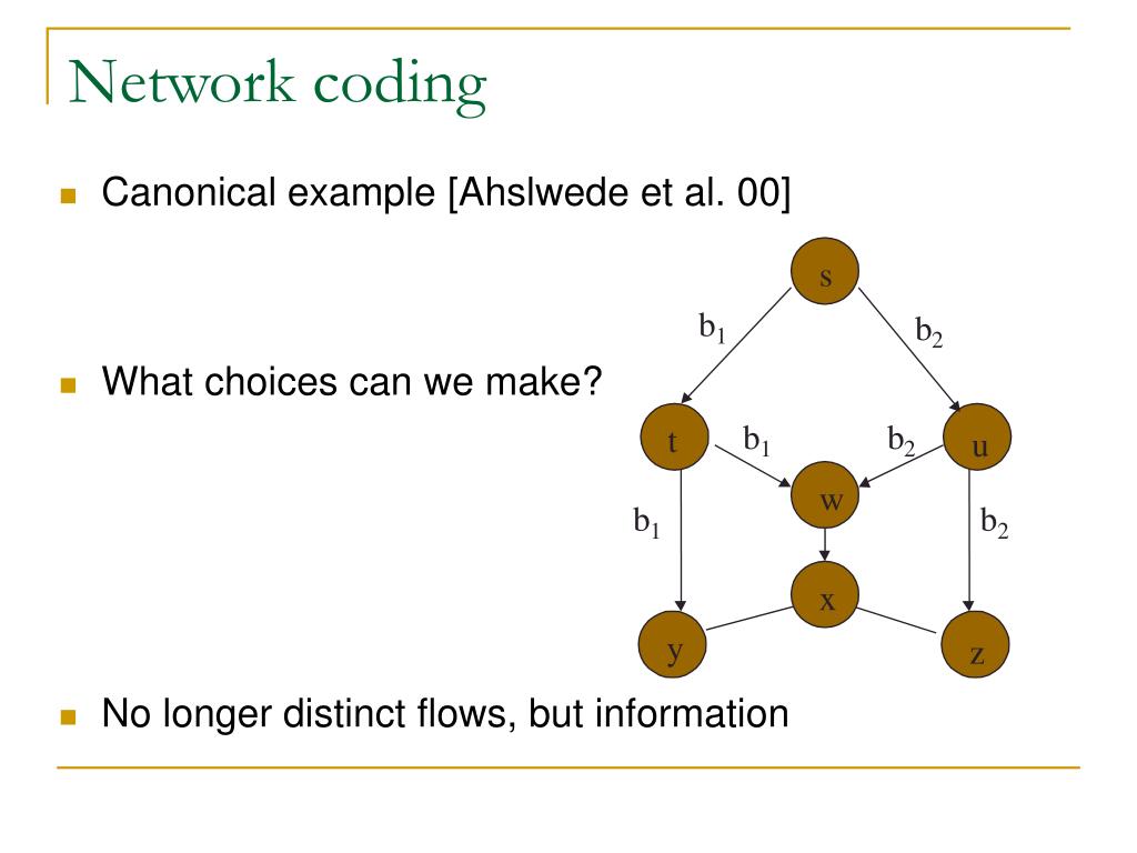 Network coding • Canonical example [Ahslwede et al. 00] • What choices can we make? • No longer distinct flows, but information s b b 1 2 b b t u 1 2 w b b 1 2 x y z
