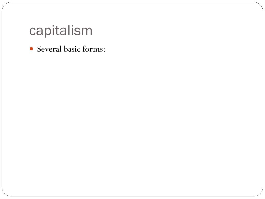 capitalism • Several basic forms: -- Mixed (state intervenes in market activity and provides some services) -- Laissez-faire (state plays minimal role) -- Anarcho (markets completely free from state)