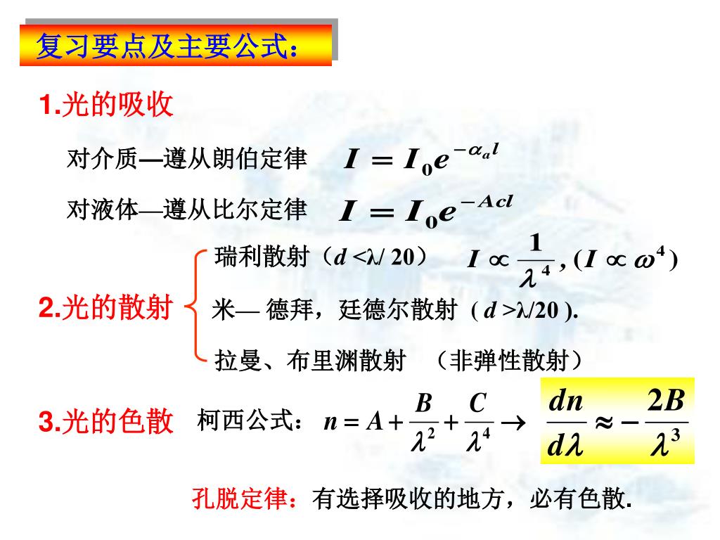 复习要点及主要公式: 1.光的吸收 对介质—遵从朗伯定律 对液体—遵从比尔定律 瑞利散射(d <λ/ 20) 2.光的散射 米— 德拜,廷德尔散射 ( d >λ/20 ). 拉曼、布里渊散射 (非弹性散射) 3.光的色散 柯西公式: 孔脱定律:有选择吸收的地方,必有色散.