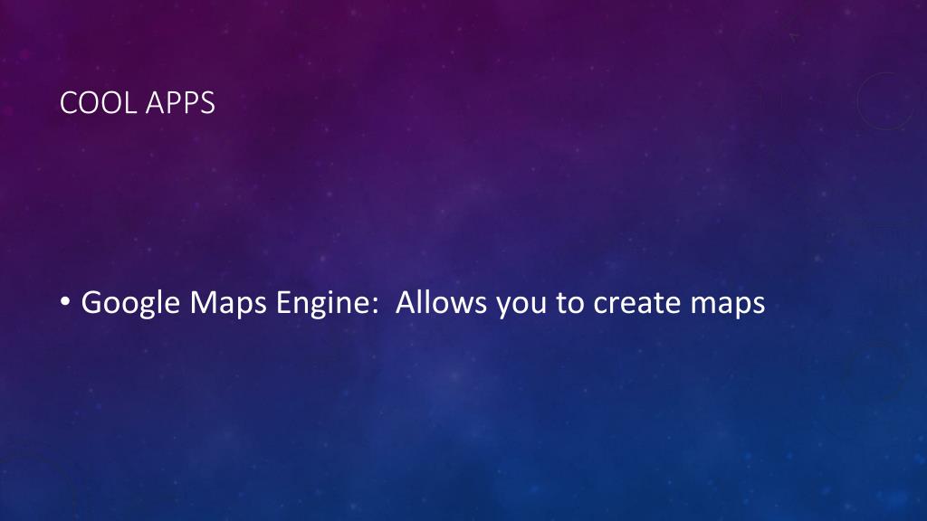 Cool APPs • Google Maps Engine: Allows you to create maps