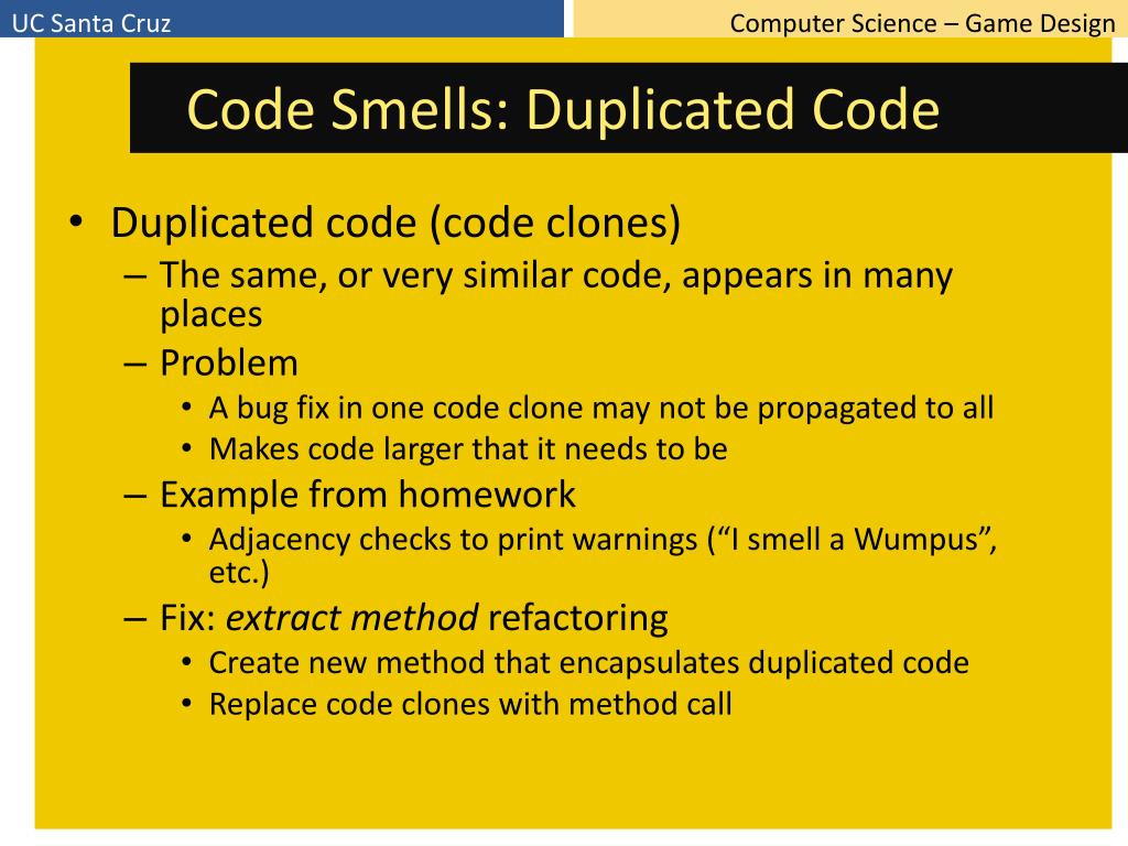 Code Smells: Duplicated Code • Duplicated code (code clones) • The same, or very similar code, appears in many places • Problem • A bug fix in one code clone may not be propagated to all • Makes code larger that it needs to be • Example from homework • Adjacency checks to print warnings (“I smell a Wumpus”, etc.) • Fix: extract method refactoring • Create new method that encapsulates duplicated code • Replace code clones with method call