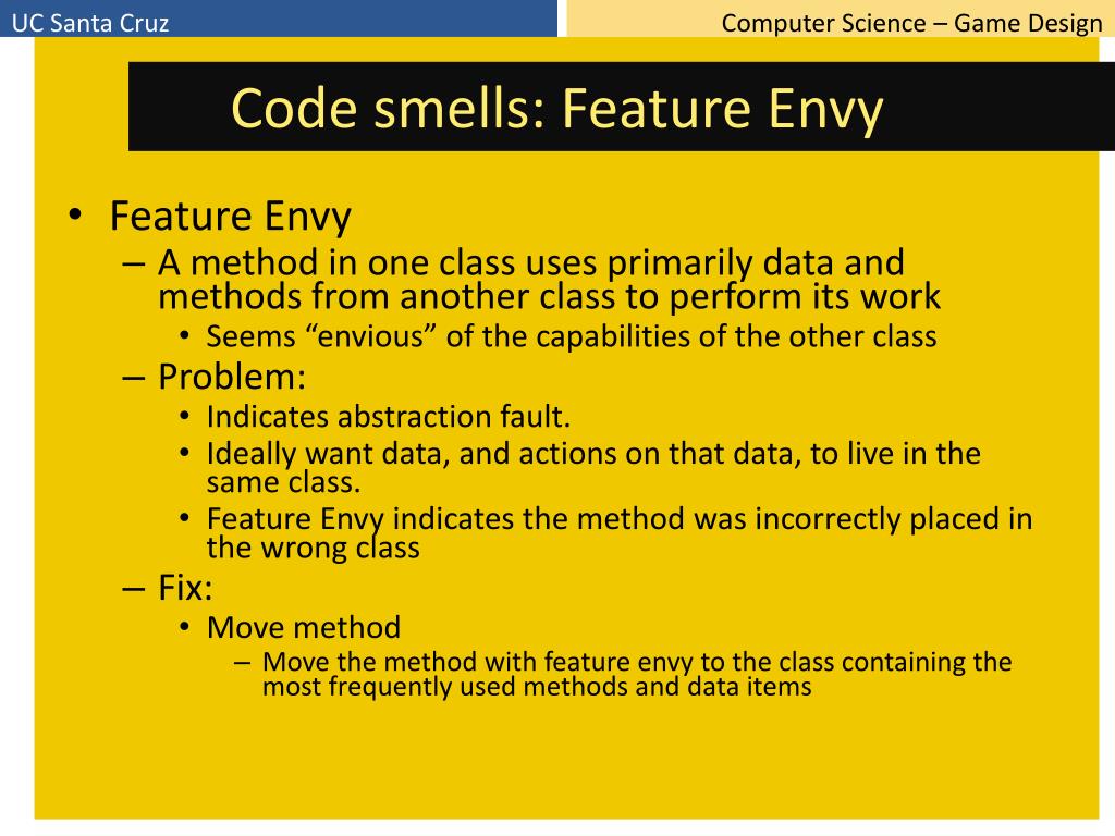 Code smells: Feature Envy • Feature Envy • A method in one class uses primarily data and methods from another class to perform its work • Seems “envious” of the capabilities of the other class • Problem: • Indicates abstraction fault. • Ideally want data, and actions on that data, to live in the same class. • Feature Envy indicates the method was incorrectly placed in the wrong class • Fix: • Move method • Move the method with feature envy to the class containing the most frequently used methods and data items