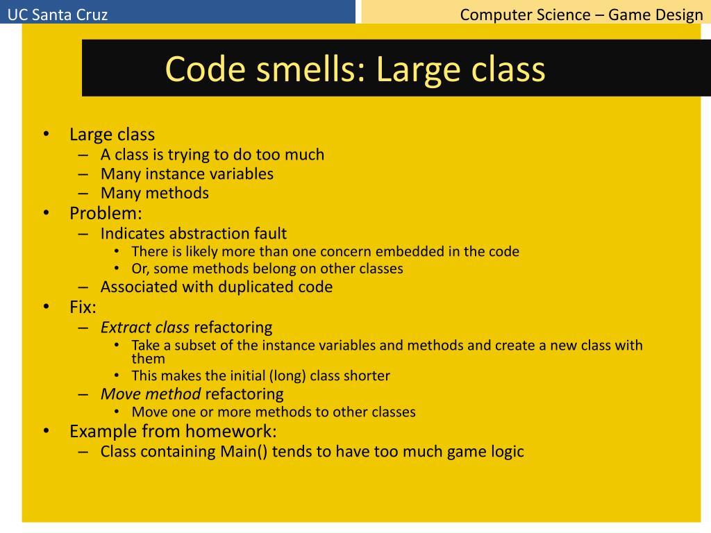 Code smells: Large class • Large class • A class is trying to do too much • Many instance variables • Many methods • Problem: • Indicates abstraction fault • There is likely more than one concern embedded in the code • Or, some methods belong on other classes • Associated with duplicated code • Fix: • Extract class refactoring • Take a subset of the instance variables and methods and create a new class with them • This makes the initial (long) class shorter • Move method refactoring • Move one or more methods to other classes • Example from homework: • Class containing Main() tends to have too much game logic