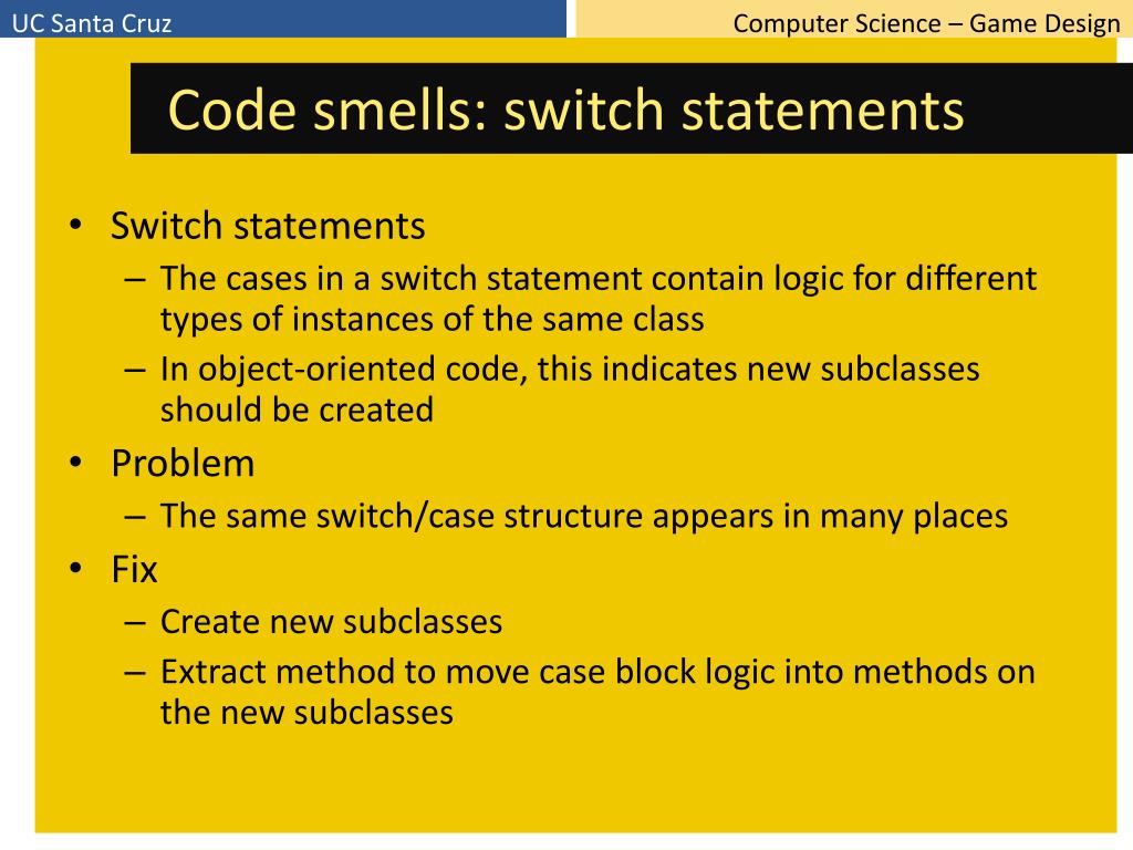 Code smells: switch statements • Switch statements • The cases in a switch statement contain logic for different types of instances of the same class • In object-oriented code, this indicates new subclasses should be created • Problem • The same switch/case structure appears in many places • Fix • Create new subclasses • Extract method to move case block logic into methods on the new subclasses