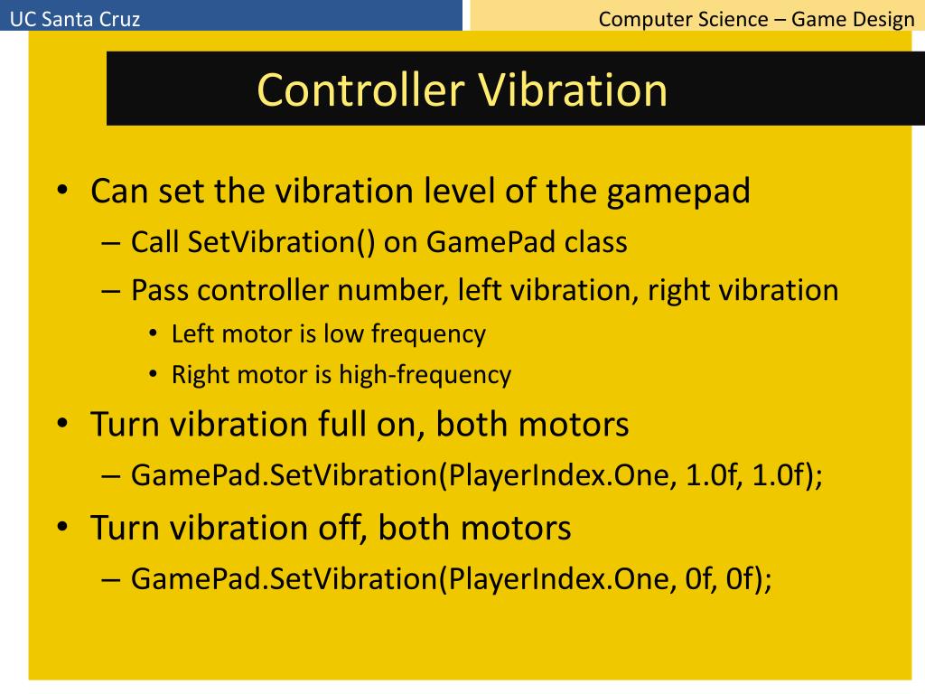 Controller Vibration • Can set the vibration level of the gamepad • Call SetVibration() on GamePad class • Pass controller number, left vibration, right vibration • Left motor is low frequency • Right motor is high-frequency • Turn vibration full on, both motors • GamePad.SetVibration(PlayerIndex.One, 1.0f, 1.0f); • Turn vibration off, both motors • GamePad.SetVibration(PlayerIndex.One, 0f, 0f);