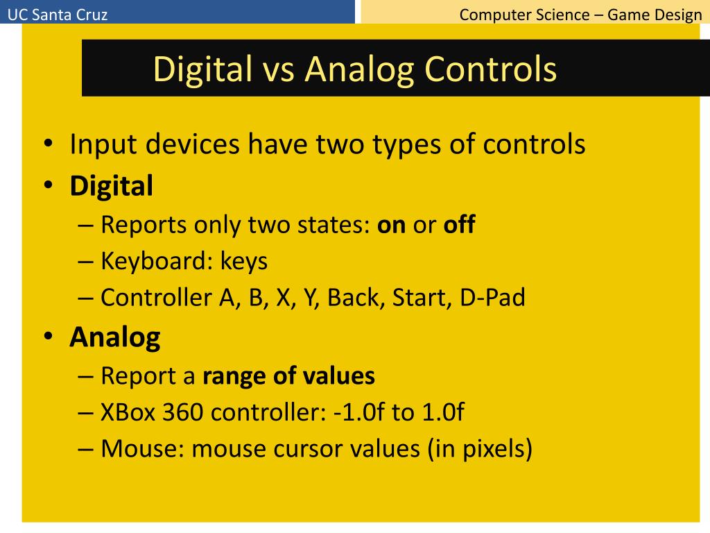 Digital vs Analog Controls • Input devices have two types of controls • Digital • Reports only two states: on or off • Keyboard: keys • Controller A, B, X, Y, Back, Start, D-Pad • Analog • Report a range of values • XBox 360 controller: -1.0f to 1.0f • Mouse: mouse cursor values (in pixels)