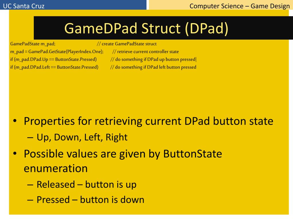 GameDPad Struct (DPad) GamePadStatem_pad; // create GamePadStatestructm_pad = GamePad.GetState(PlayerIndex.One); // retrieve current controller stateif (m_pad.DPad.Up == ButtonState.Pressed) // do something if DPad up button pressed|if (m_pad.DPad.Left == ButtonState.Pressed) // do something if DPad left button pressed • Properties for retrieving current DPad button state • Up, Down, Left, Right • Possible values are given by ButtonState enumeration • Released – button is up • Pressed – button is down