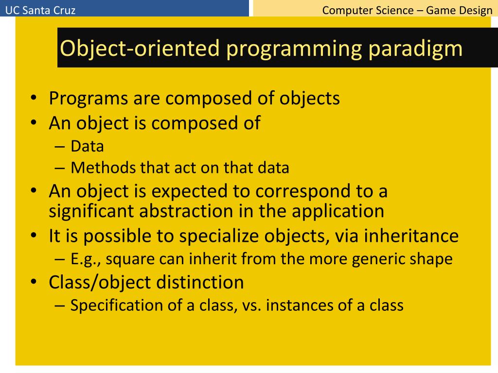 Object-oriented programming paradigm • Programs are composed of objects • An object is composed of • Data • Methods that act on that data • An object is expected to correspond to a significant abstraction in the application • It is possible to specialize objects, via inheritance • E.g., square can inherit from the more generic shape • Class/object distinction • Specification of a class, vs. instances of a class
