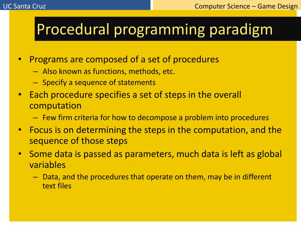 Procedural programming paradigm • Programs are composed of a set of procedures • Also known as functions, methods, etc. • Specify a sequence of statements • Each procedure specifies a set of steps in the overall computation • Few firm criteria for how to decompose a problem into procedures • Focus is on determining the steps in the computation, and the sequence of those steps • Some data is passed as parameters, much data is left as global variables • Data, and the procedures that operate on them, may be in different text files