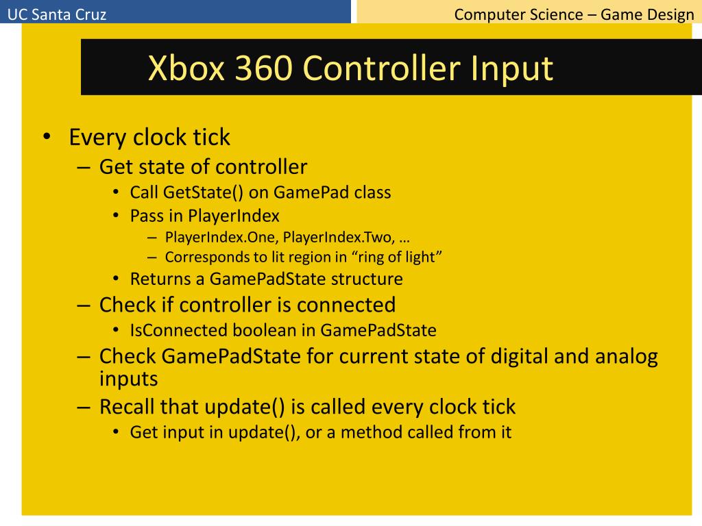 Xbox 360 Controller Input • Every clock tick • Get state of controller • Call GetState() on GamePad class • Pass in PlayerIndex • PlayerIndex.One, PlayerIndex.Two, … • Corresponds to lit region in “ring of light” • Returns a GamePadState structure • Check if controller is connected • IsConnected boolean in GamePadState • Check GamePadState for current state of digital and analog inputs • Recall that update() is called every clock tick • Get input in update(), or a method called from it
