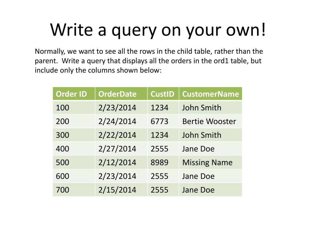 Write a query on your own! Normally, we want to see all the rows in the child table, rather than the parent. Write a query that displays all the orders in the ord1 table, but include only the columns shown below: