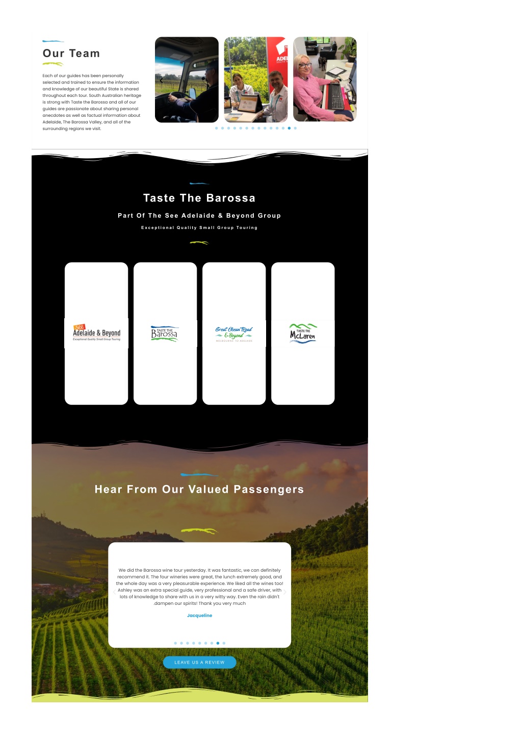 3. Our Team Each of our guides has been personally selected and trained to ensure the information and knowledge of our beautiful State is shared throughout each tour. South Australian heritage is strong with Taste the Barossa and all of our guides are passionate about sharing personal anecdotes as well as factual information about Adelaide, The Barossa Valley, and all of the surrounding regions we visit.   Taste The Barossa Part Of The See Adelaide & Beyond Group E x c e p t i o n a l Q u a l i t y S m a l l G r o u p To u r i n g Hear From Our Valued Passengers We did the Barossa wine tour yesterday. It was fantastic, we can definitely recommend it. The four wineries were great, the lunch extremely good, and the whole day was a very pleasurable experience. We liked all the wines too! Ashley was an extra special guide, very professional and a safe driver, with lots of knowledge to share with us in a very witty way. Even the rain didn't .dampen our spirits! Thank you very much   Jacqueline LEAVE US A REVIEW