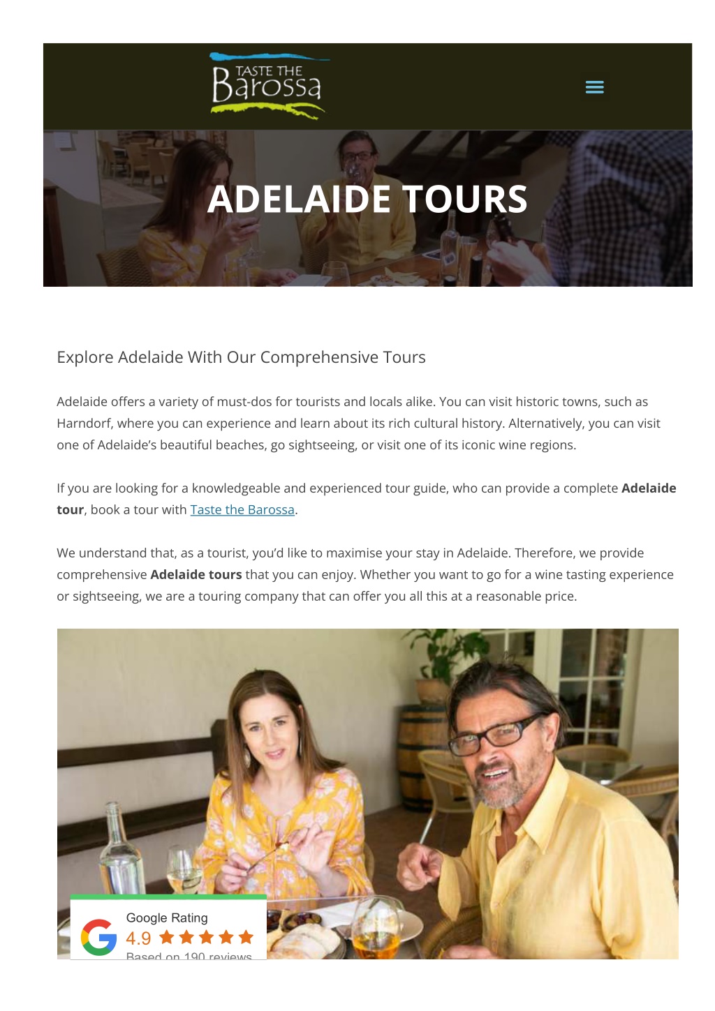 ADELAIDE TOURS Explore Adelaide With Our Comprehensive Tours Adelaide o몭ers a variety of must-dos for tourists and locals alike. You can visit historic towns, such as Harndorf, where you can experience and learn about its rich cultural history. Alternatively, you can visit one of Adelaide’s beautiful beaches, go sightseeing, or visit one of its iconic wine regions. If you are looking for a knowledgeable and experienced tour guide, who can provide a complete Adelaide tour, book a tour with Taste the Barossa. We understand that, as a tourist, you’d like to maximise your stay in Adelaide. Therefore, we provide comprehensive Adelaide tours that you can enjoy. Whether you want to go for a wine tasting experience or sightseeing, we are a touring company that can o몭er you all this at a reasonable price. Google Rating 4.9 Based on 190 reviews