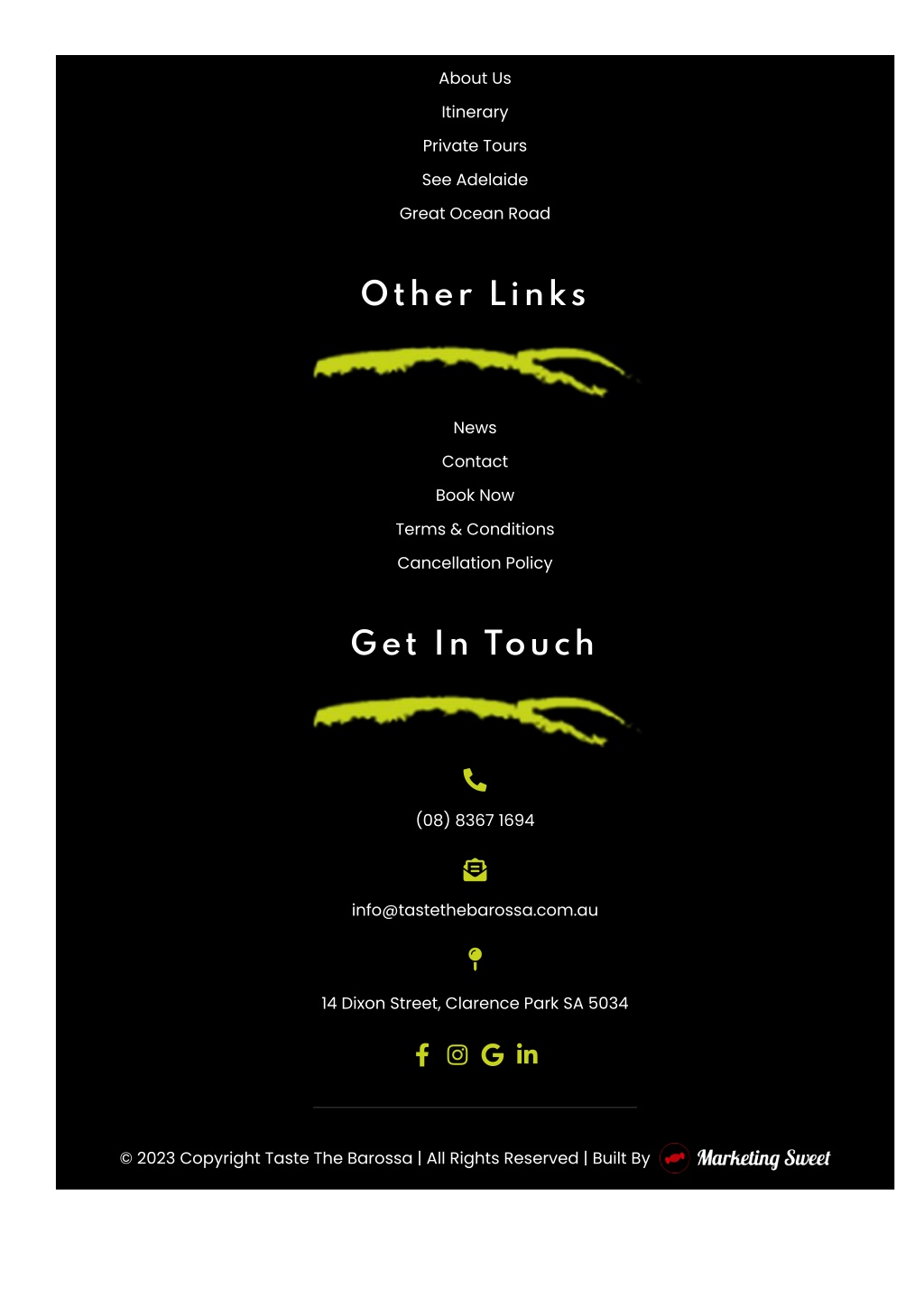 Home About Us Itinerary Private Tours See Adelaide Great Ocean Road Other Links News Contact Book Now Terms & Conditions Cancellation Policy Get In Touch (08) 8367 1694 info@tastethebarossa.com.au 14 Dixon Street, Clarence Park SA 5034 © 2023 Copyright Taste The Barossa | All Rights Reserved | Built By