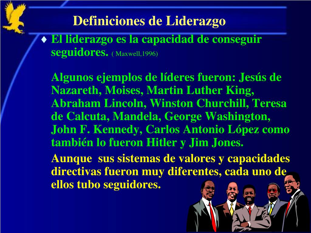 Definiciones de Liderazgo • El liderazgoeslacapacidadde conseguir seguidores. ( Maxwell,1996) Algunosejemplosde líderes fueron: Jesúsde Nazareth, Moises, Martin Luther King, Abraham Lincoln, Winston Churchill, Teresa de Calcuta, Mandela, George Washington, John F. Kennedy, Carlos Antonio López como tambiénlofueron Hitler yJim Jones. Aunquesussistemas de valores y capacidades directivasfueronmuydiferentes, cada uno de ellos tubo seguidores.