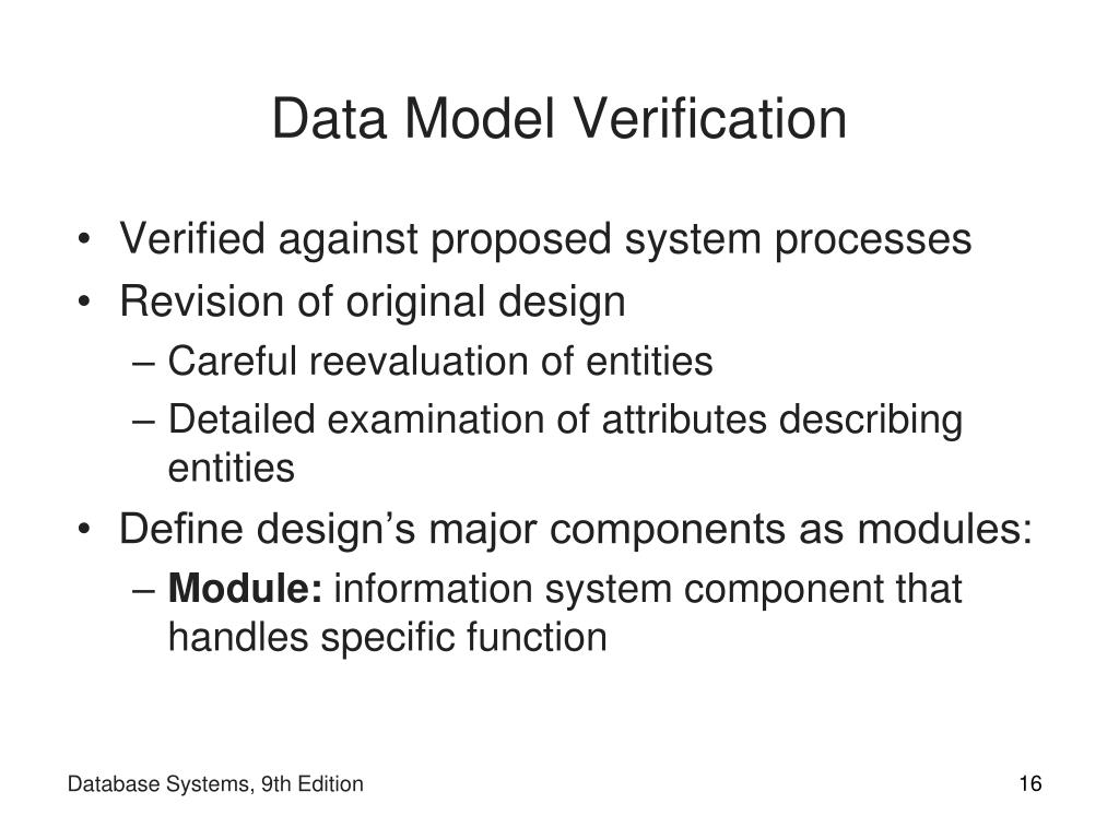 Data Model Verification • Verified against proposed system processes • Revision of original design • Careful reevaluation of entities • Detailed examination of attributes describing entities • Define design’s major components as modules: • Module: information system component that handles specific function Database Systems, 9th Edition