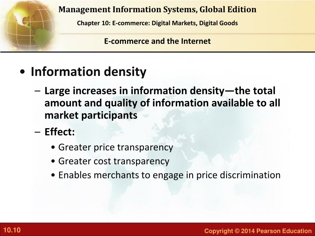 E-commerce and the Internet • Information density • Large increases in information density—the total amount and quality of information available to all market participants • Effect: • Greater price transparency • Greater cost transparency • Enables merchants to engage in price discrimination