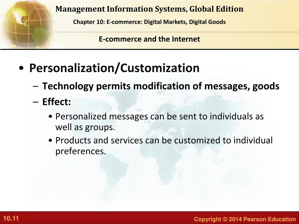 E-commerce and the Internet • Personalization/Customization • Technology permits modification of messages, goods • Effect: • Personalized messages can be sent to individuals as well as groups. • Products and services can be customized to individual preferences.