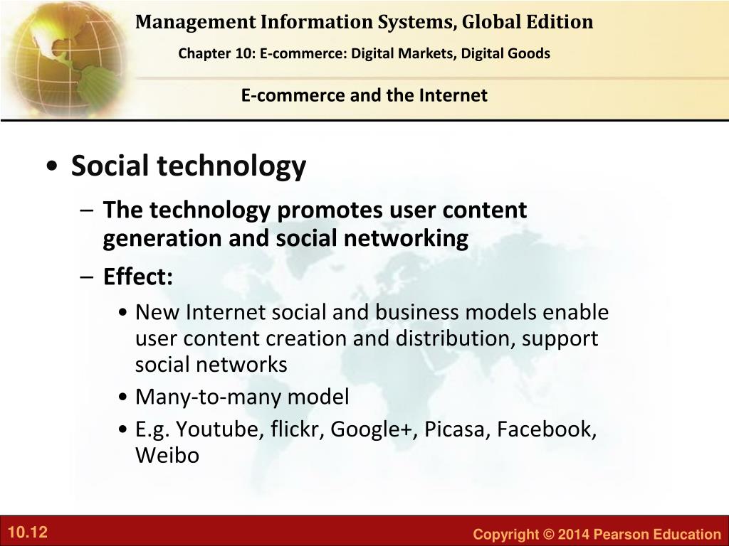 E-commerce and the Internet • Social technology • The technology promotes user content generation and social networking • Effect: • New Internet social and business models enable user content creation and distribution, support social networks • Many-to-many model • E.g. Youtube, flickr, Google+, Picasa, Facebook, Weibo