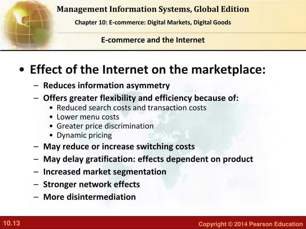 E-commerce and the Internet • Global reach • The technology reaches across national boundaries, around Earth • Effect: • Commerce enabled across cultural and national boundaries seamlessly and without modification. • Marketspace includes, potentially, billions of consumers and millions of businesses worldwide.