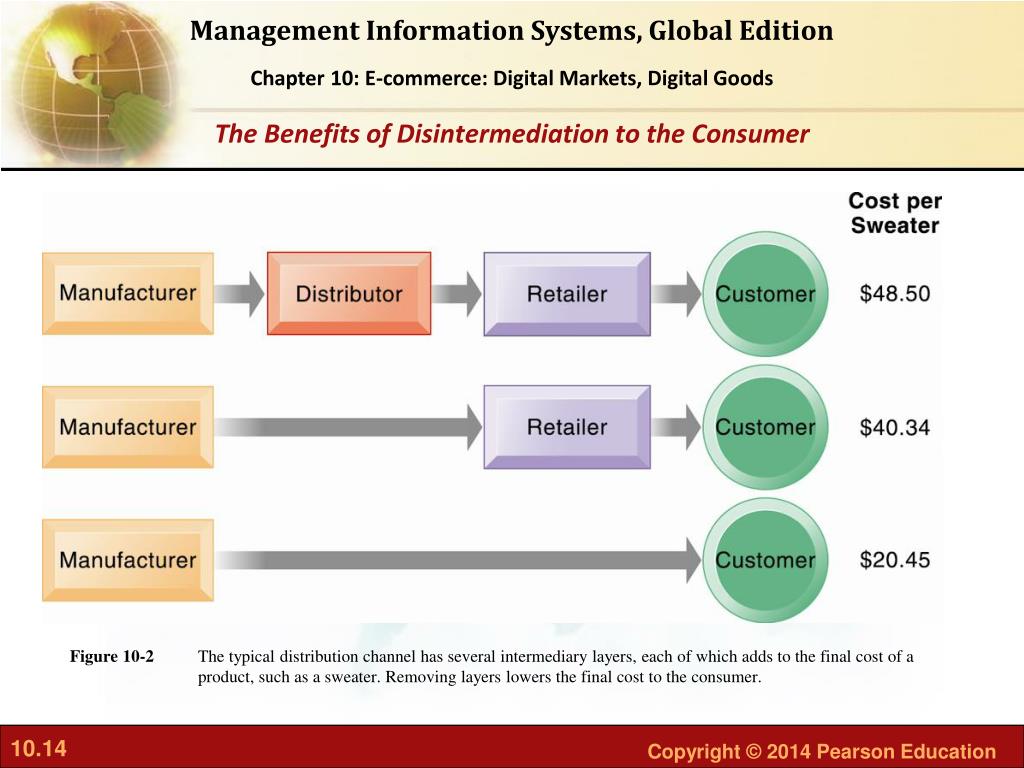 The typical distribution channel has several intermediary layers, each of which adds to the final cost of a product, such as a sweater. Removing layers lowers the final cost to the consumer. Figure 10-2 The Benefits of Disintermediation to the Consumer