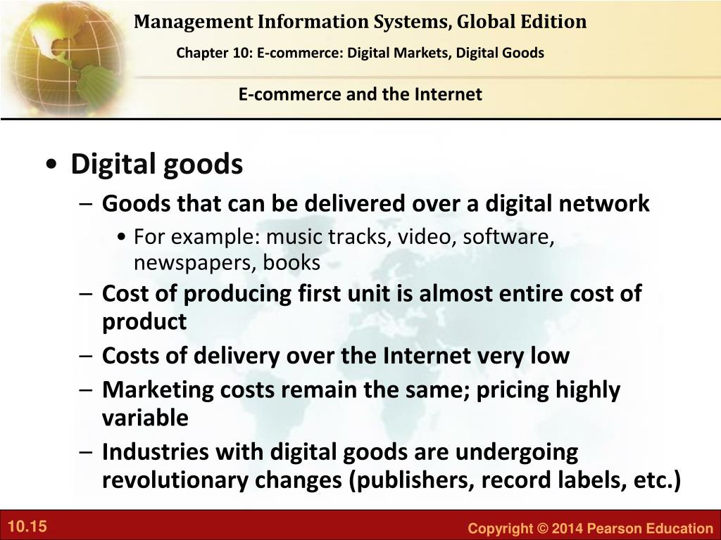 E-commerce and the Internet • Digital goods • Goods that can be delivered over a digital network • For example: music tracks, video, software, newspapers, books • Cost of producing first unit is almost entire cost of product • Costs of delivery over the Internet very low • Marketing costs remain the same; pricing highly variable • Industries with digital goods are undergoing revolutionary changes (publishers, record labels, etc.)