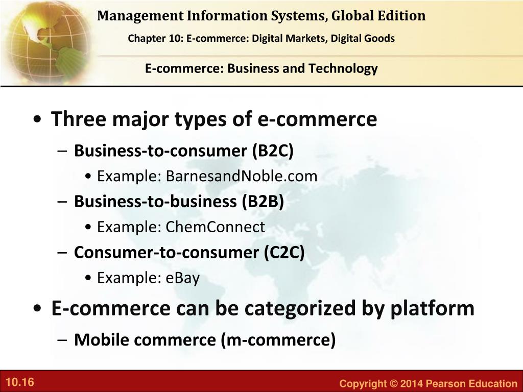 E-commerce: Business and Technology • Three major types of e-commerce • Business-to-consumer (B2C) • Example: BarnesandNoble.com • Business-to-business (B2B) • Example: ChemConnect • Consumer-to-consumer (C2C) • Example: eBay • E-commerce can be categorized by platform • Mobile commerce (m-commerce)