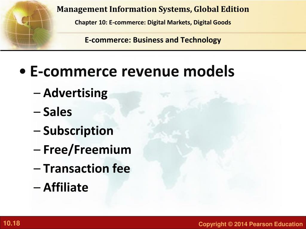E-commerce: Business and Technology • E-commerce revenue models • Advertising • Sales • Subscription • Free/Freemium • Transaction fee • Affiliate
